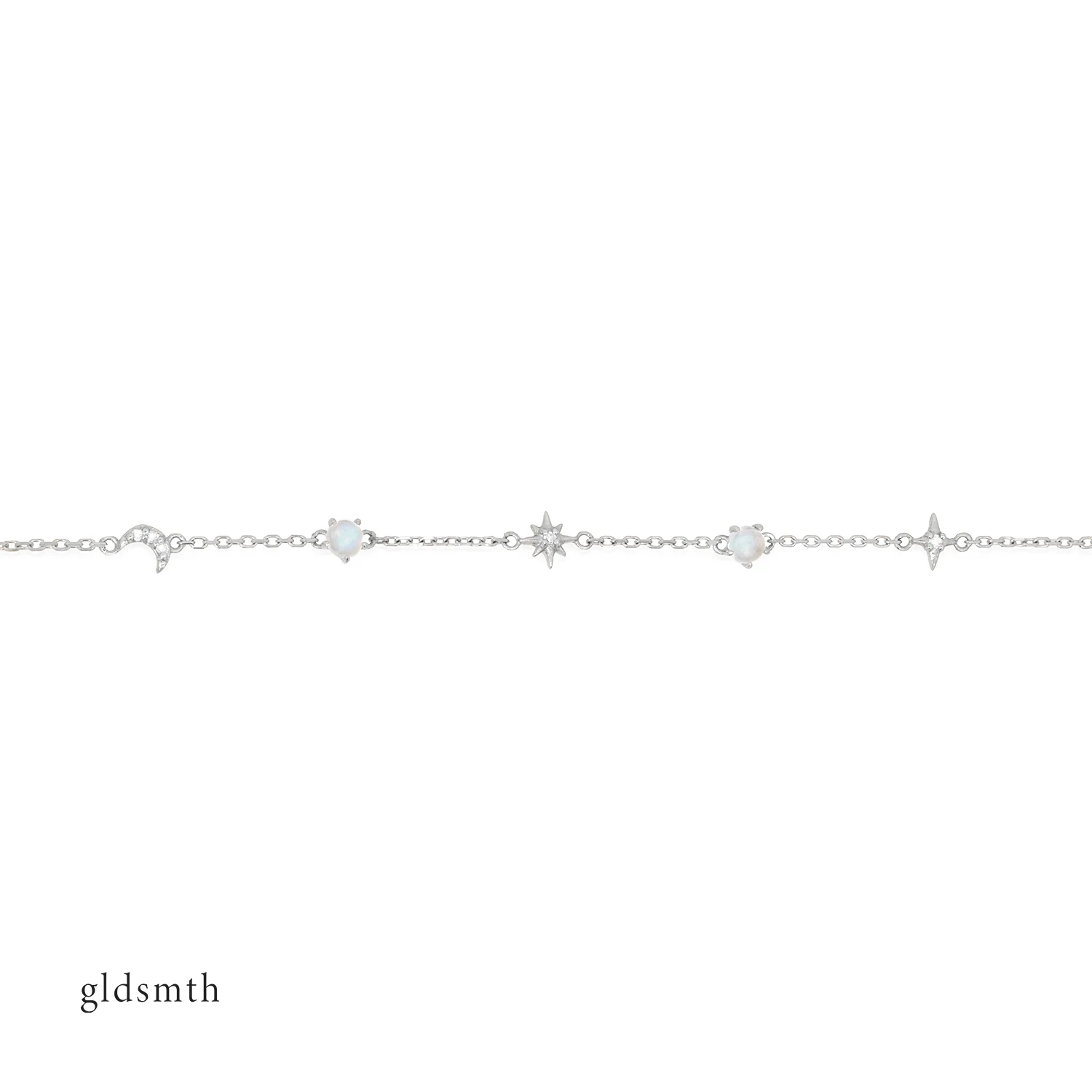 Silhouettes of stars and sparks cradle moonstones and white diamonds on Zara. A fine addition to the 13th edition of our gldsmth collection.