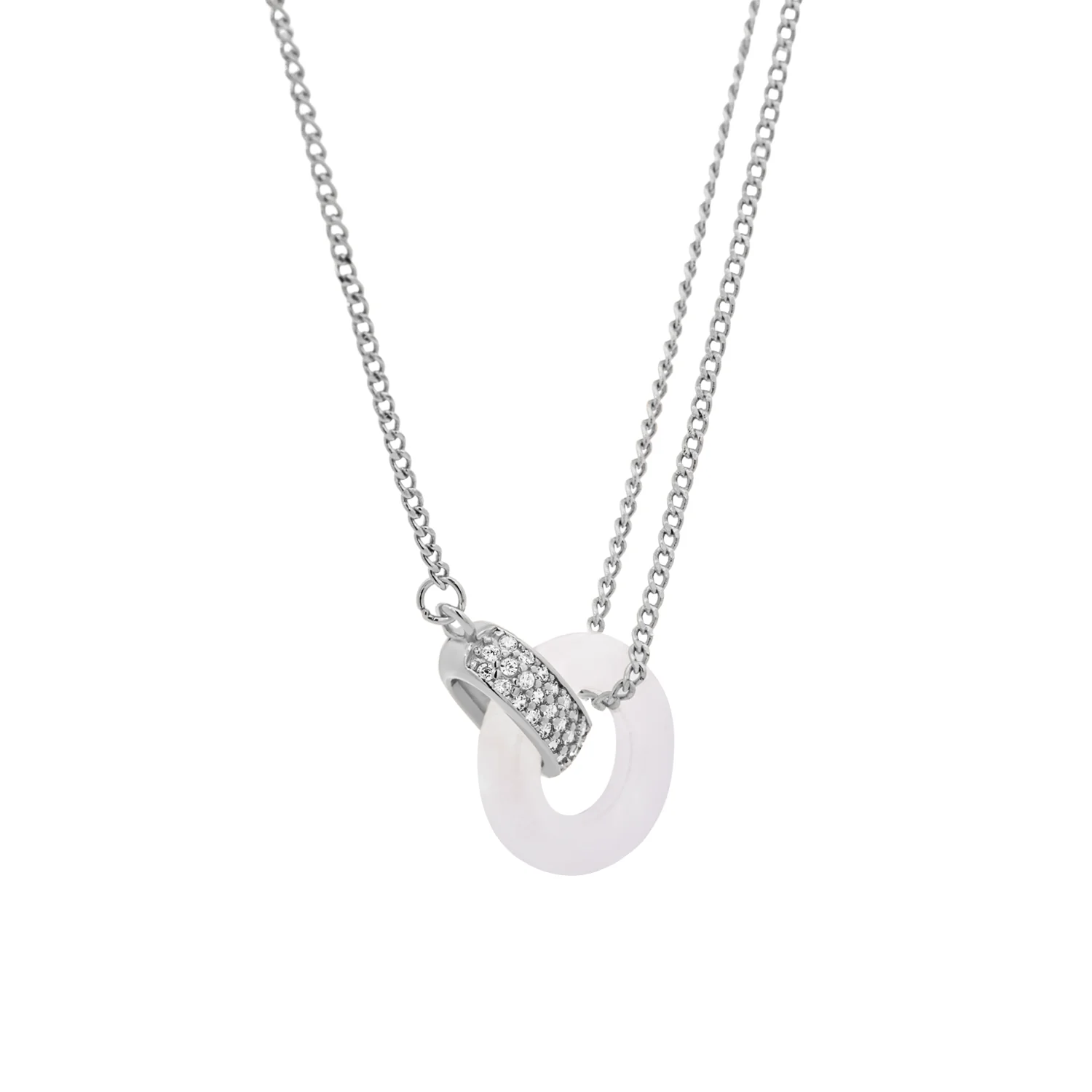 The double pendant style on the Eternal Necklace features an interlocking design, a circular ring of white jade accompanied by an oval encrusted with cubic zirconia stones on one side. Goes well with its matching bracelet and hoops.