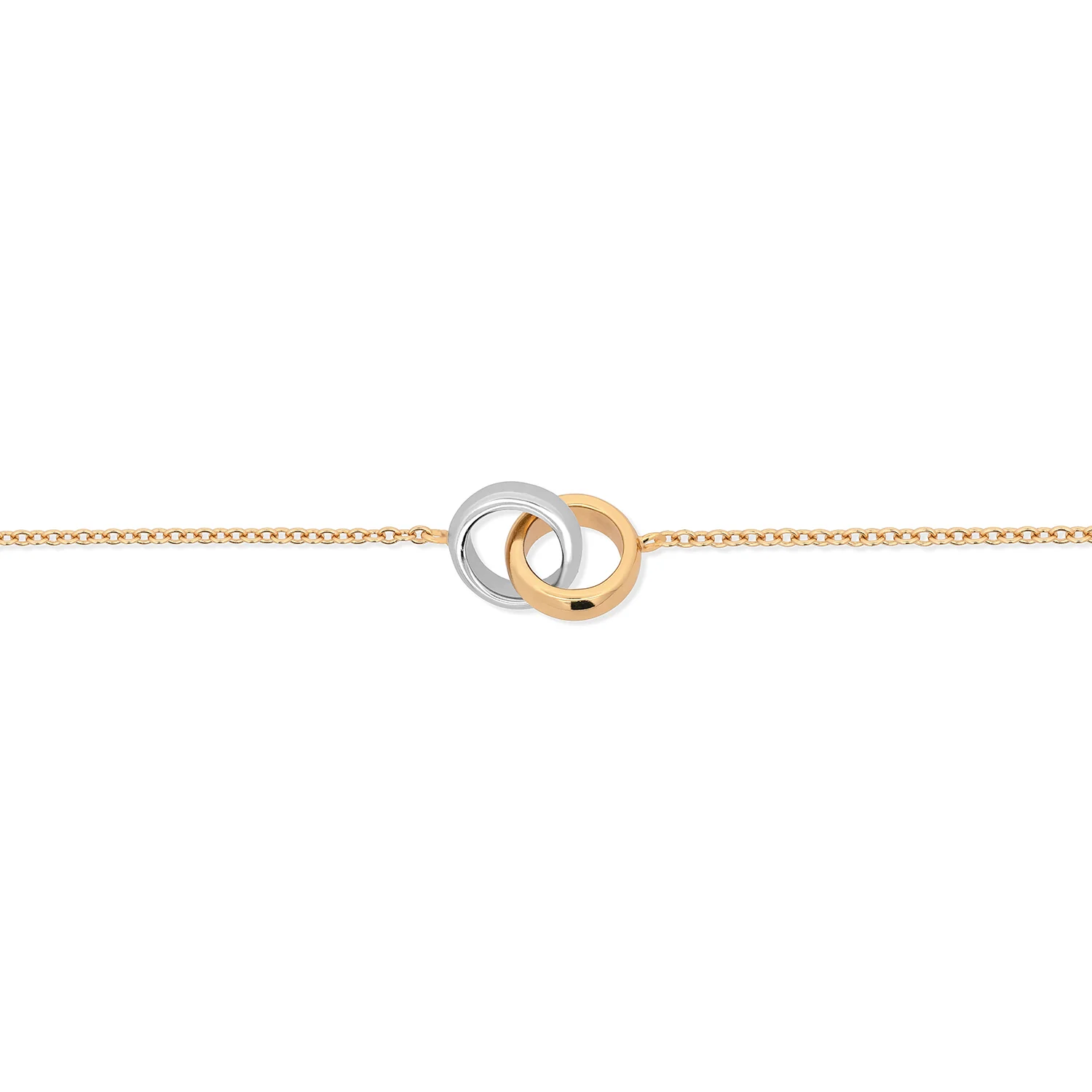 The Unity's contemporary interlocking pendant makes it a versatile piece that wears well on its own or with other stacker bracelets of gold and silver finishes.